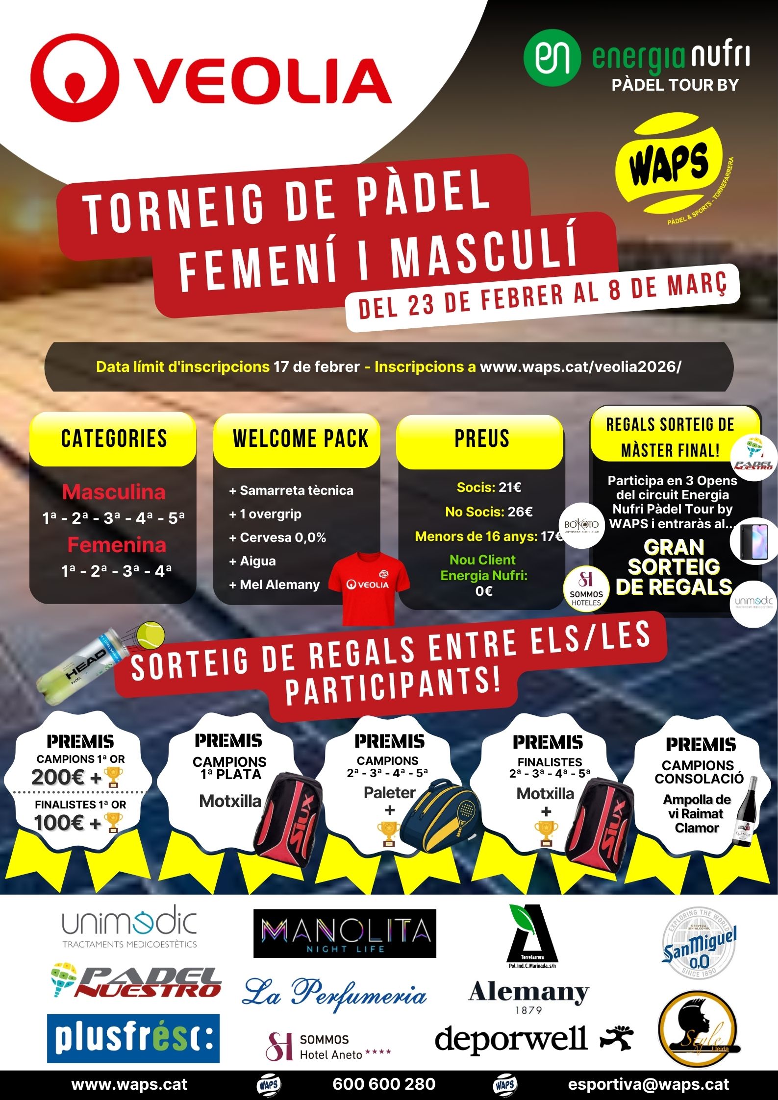 Inscripció: Socis 21€, No socis 26€, Menors 16 anys: 17€, Nous clients Energia Nufri:0€ .